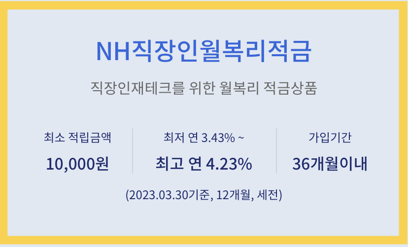 NH직장인월복리적금은 농협에서 출시된 직장인을 위한 재테크 상품입니다. 직장인이라면 누구나 자유롭게 가입할 수 있고 급여 이체 실적 등의 조건이 충족될 경우 12개월을 기준으로 연 4.23%의 이자율이 적용됩니다. 그럼 NH직장인월복리적금 농협 금리 이자 재테크 신청방법에 대해 자세히 날아보도록 하겠습니다.